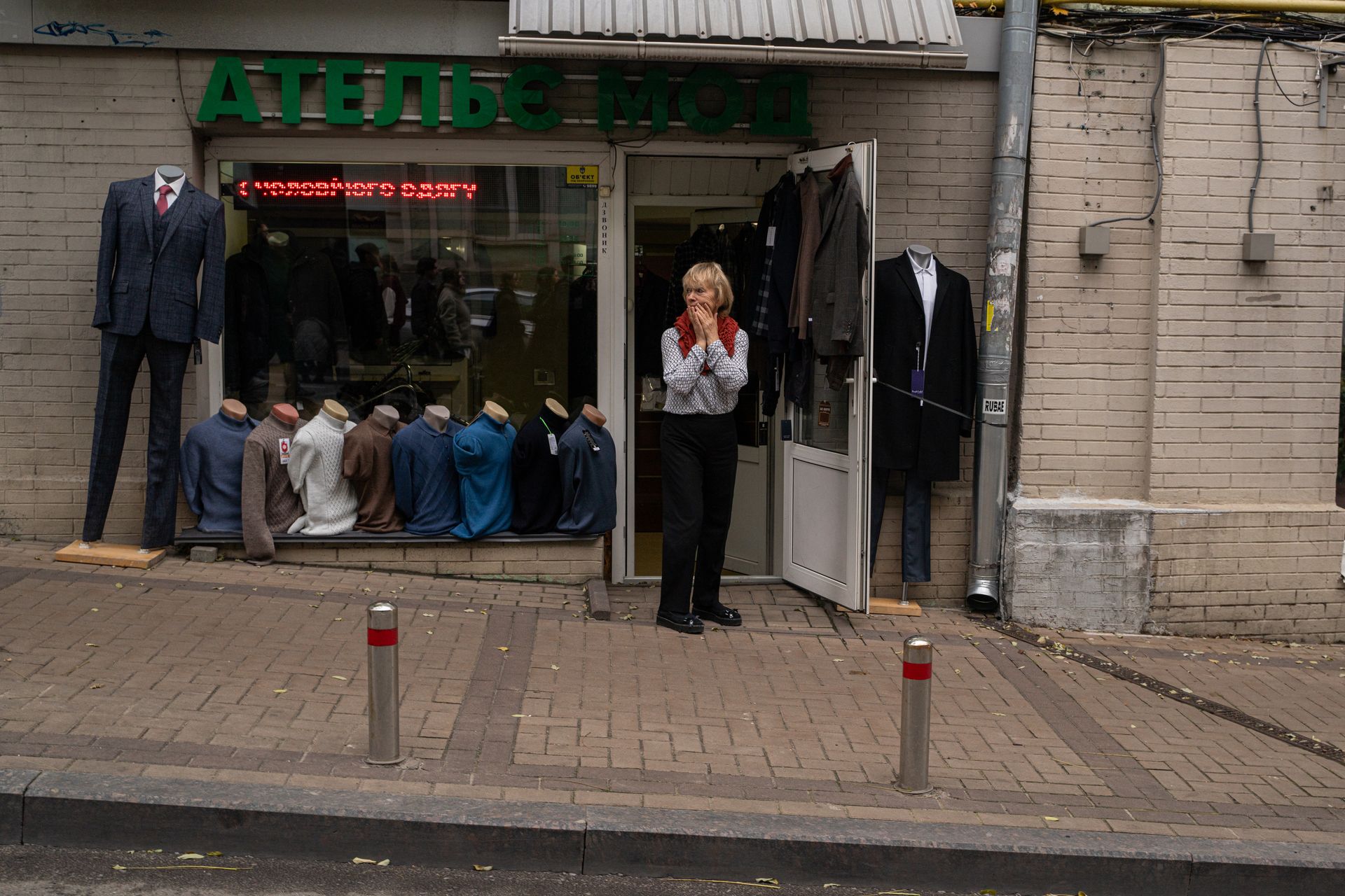 A woman, who works in a tailor’s shop, watches the ceremony nearby. (Ray Baseley / the Kyiv Independent)