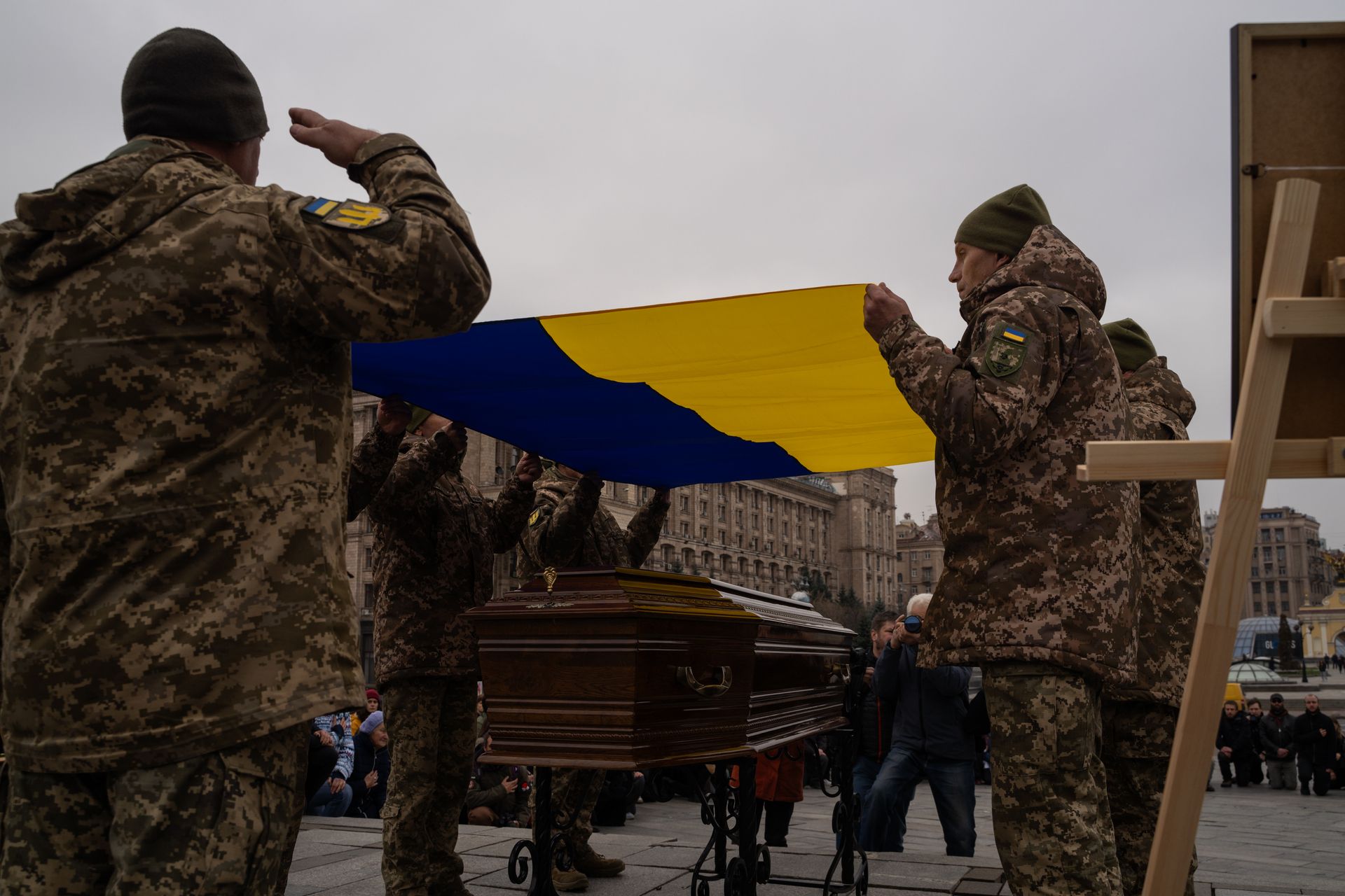 Soldiers hold the Ukrainian flag over the coffin during the ceremony. (Ray Baseley / the Kyiv Independent)