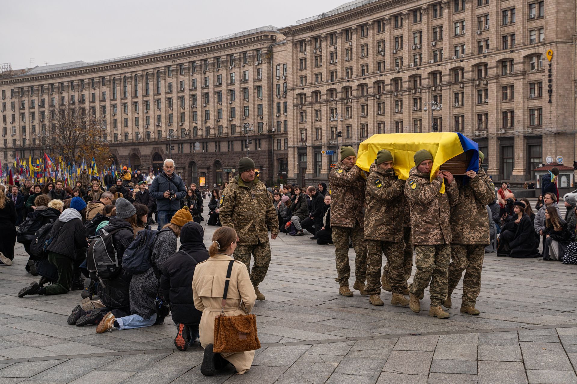 People kneeling in front of the coffin. (Ray Baseley / the Kyiv Independent)