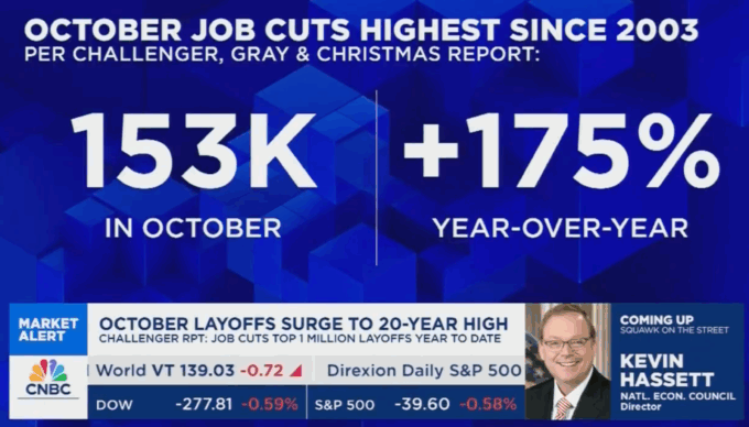 CNBC reporter on the October jobs numbers: “This one was a doozy. The most job cuts for any October in more than two decades, going back to 2003. Companies announced about 153,000 job cuts last month, which was almost triple the number during the same month last year.”