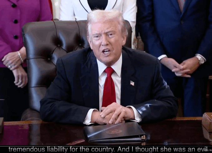 Trump: “I think she’s an evil woman. I’m glad she’s retiring. I think she, uh, did the country a great service by retiring. She was a tremendous liability for the country. And I thought she was an evil woman who did a poor job to cost the country a lot of damages and in reputation. I thought she was terrible.”