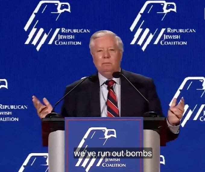 An ebullient Lindsey Graham ranting at the Republican Jewish Coalition about Trump the Bomber: “I feel good about the Republican Party and where we’re going as a nation. We’re killing all the right people and we’re cutting your taxes. Trump is my favorite president. We’ve run out of bombs. We” didn’t run out of bombs during World War II.”