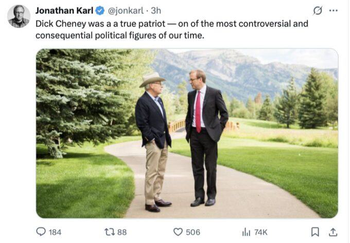 As a “devoted public servant,” Cheney helped steal an election, shot a man in the face and covered it up, lied the US into a war, set up a black ops unit inside the White House to run kidnappings and torture sessions, authorized mass surveillance of Americans, and steered long-term no-bid contracts to his former corporation, which is was still deeply invested in…