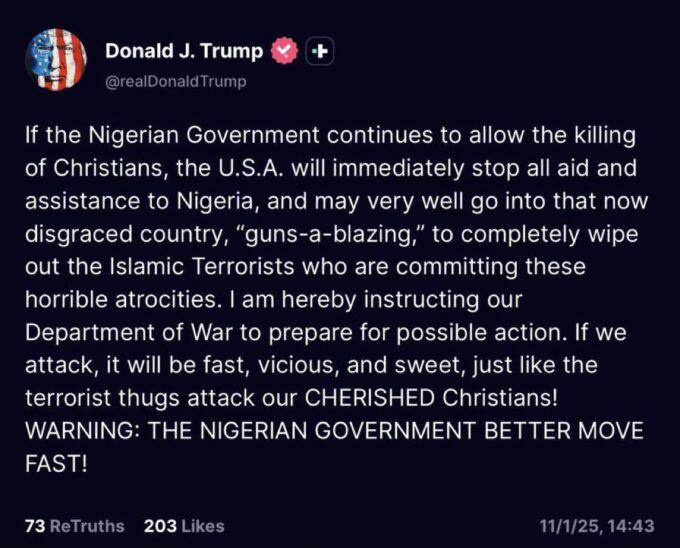 Trump is threatening a “fast, vicious and sweet” attack on…Nigeria.