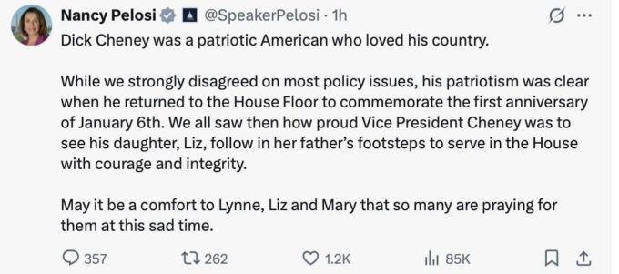 Misogynistic invective, aimed at someone who outfoxed him numerous times, aside, why couldn’t one high-ranking Democrat say something similar about Cheney, instead of mourning his death as if he were an American Chou En-Lai, instead of the malevolent miscreant he was?