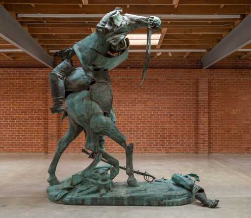 The reimagined statue, “Unmanned Drone,” dissects the original sculpture created by artist Charles Keck into an unsettling, Hieronymus Bosch-like composition. “Altered beyond recognition, it is, however, still horse and rider,” the gallery says. “Instead of charging into battle, Walker’s headless horseman wanders in Civil War purgatory, dragging its sword over a ruined battlefield.”