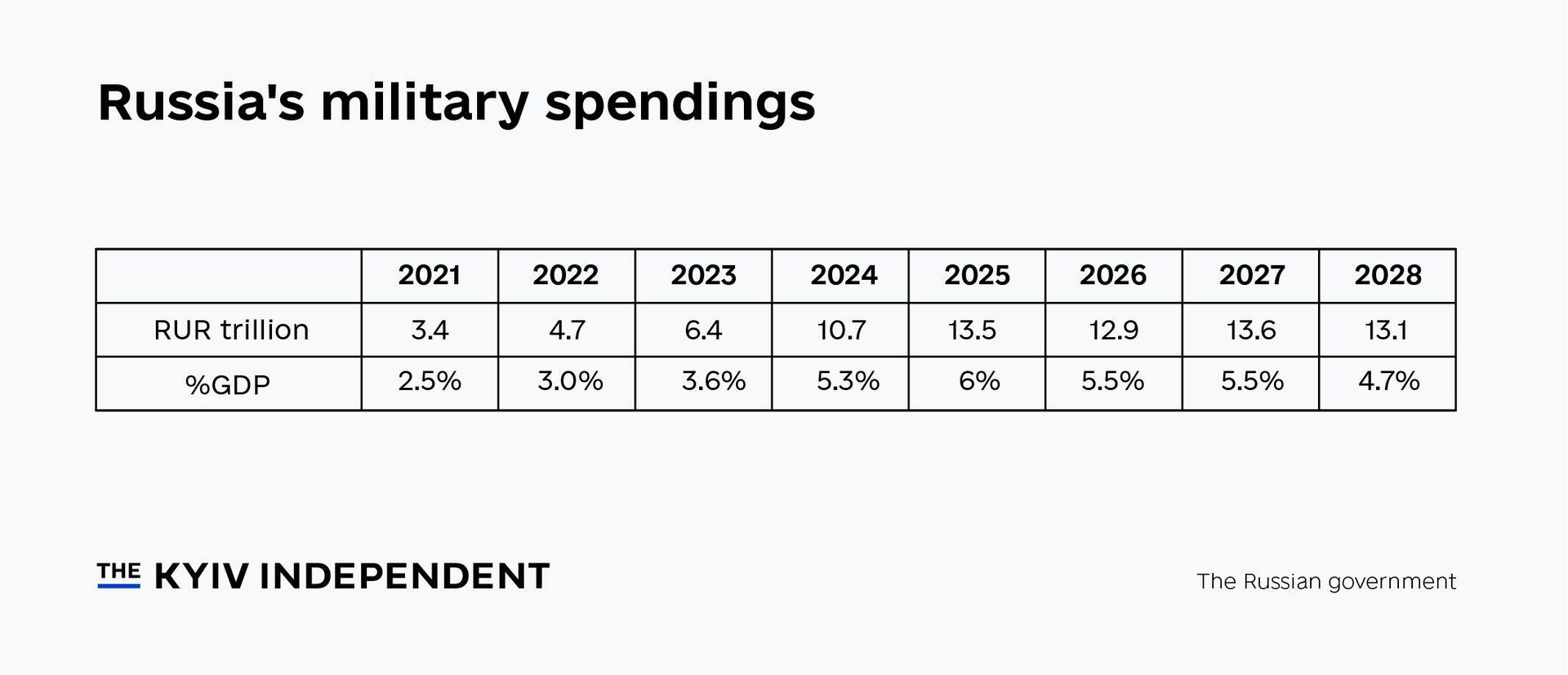 Russia’s military spending is projected to decline from 5.3% of its GDP to 4.7% by 2028 (Nizar al-Rifai/The Kyiv Independent)