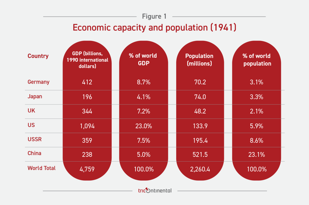 Sources: Population data mainly from Maddison (2010); GDP data mainly from Harrison (1998), p. 10, table 1.3; USSR population for 1941 from Statista (2025); China and world-total GDP are corroborated estimates by Tricontinental: Institute for Social Research. See Section 2 for full methodology.