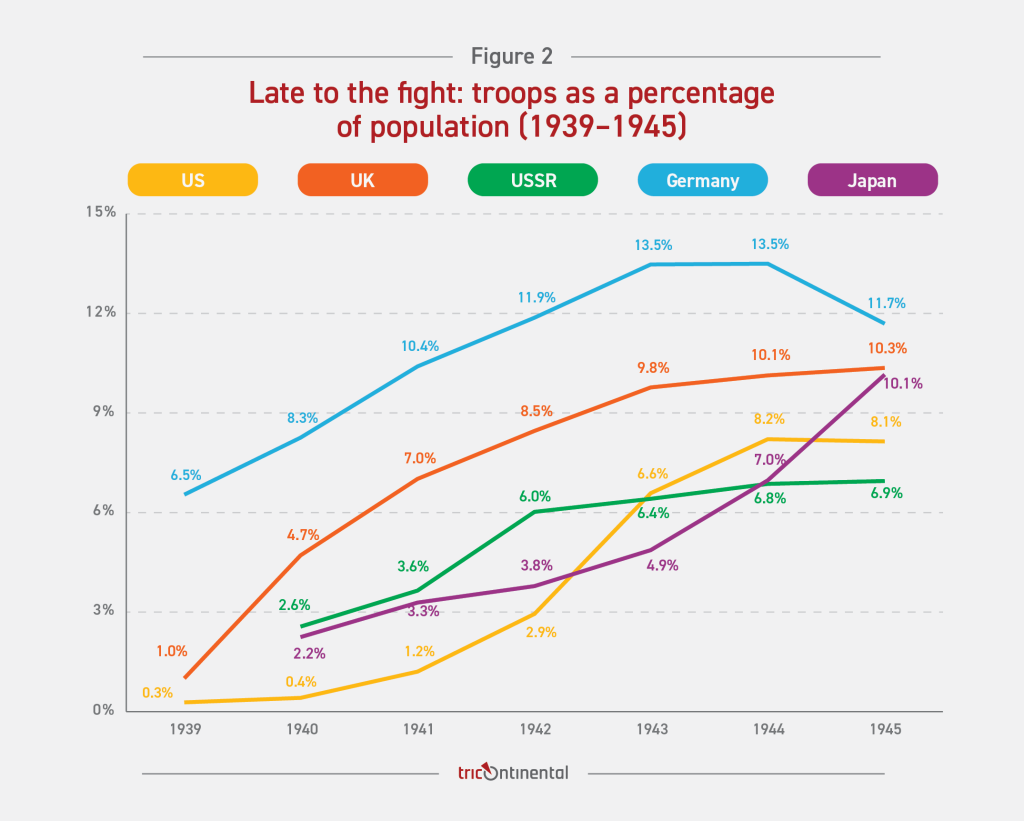 The US dedicated just 11% of its GNP to military spending before Pearl Harbor. The US military in December 1941 fielded only 1.62 million troops from a population of 133.9 million – just 1.2% of its population was under arms. By contrast, Germany had 7.3 million troops from a population of 70.2 million (10.4%), and the Soviet Union had 7.1 million from a population of 195.4 million (3.6%) by year’s end. Britain, despite declaring war in 1939, had reached 53% of national expenditure on military efforts, but much of this went to protecting empire, not fighting fascism directly. In North Africa, British forces fought to maintain colonial control, not liberate populations. Churchill’s quote: ‘I have not become the King’s First Minister to liquidate the British Empire’. 23