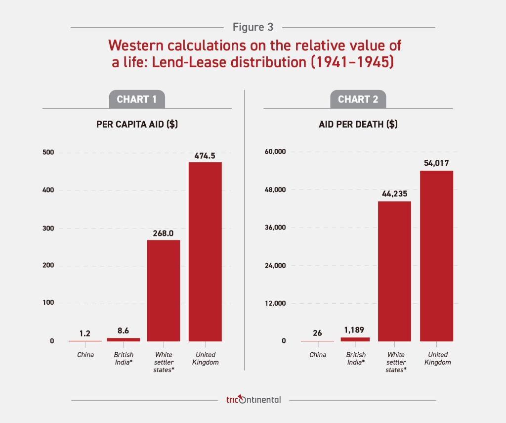Even after entering the war, China received just $632 million in Lend-Lease aid (1941–1945) while Britain, along with its two white settler states (Australia and New Zealand), received $25.8 billion of the $30.3 billion assigned by the US to the ‘British Empire’.