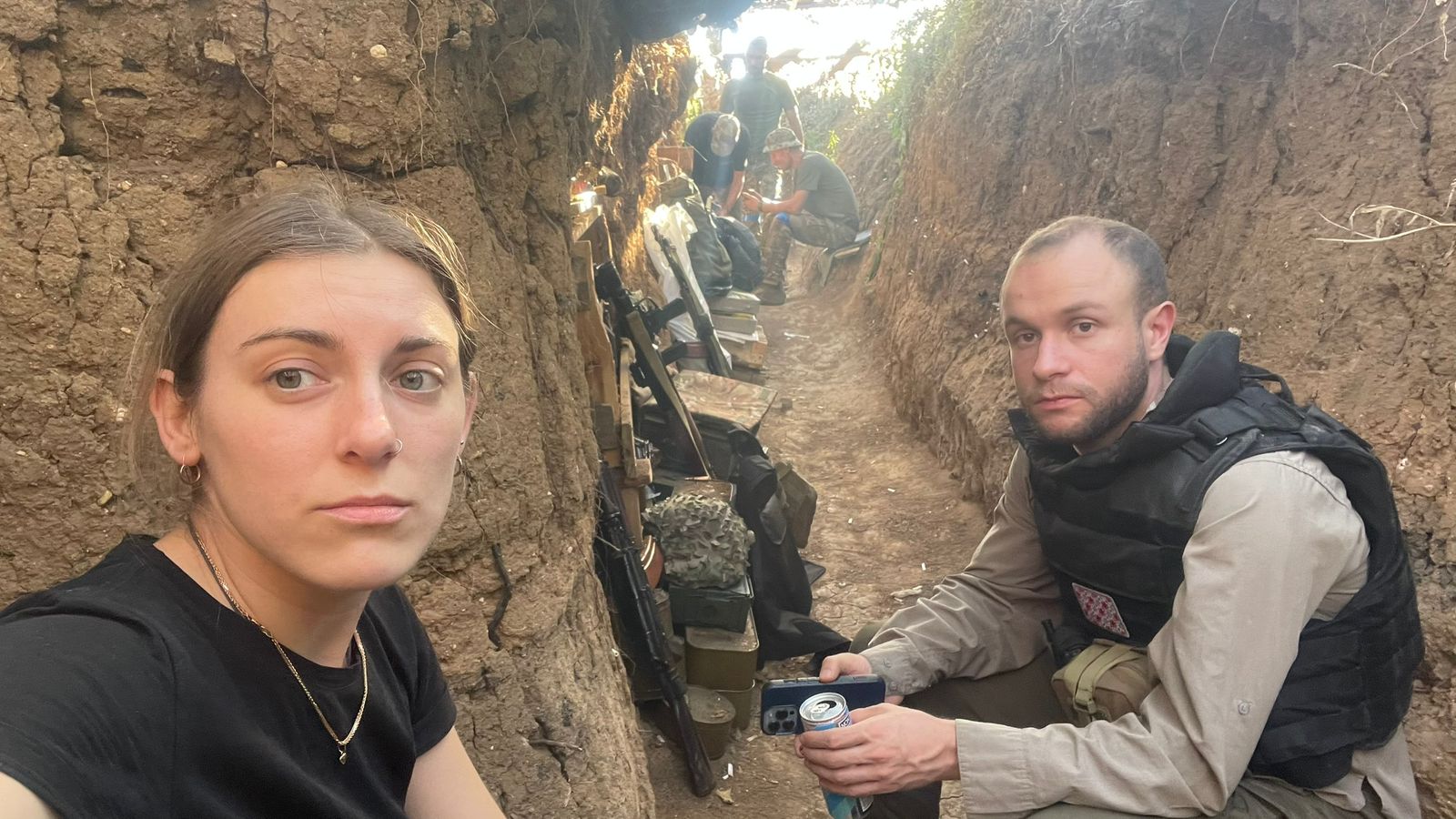 The Kyiv Independent’s videographer Olena Zashko and reporter Francis Farrell during an embed with an infantry unit near Toretsk, Donetsk Oblast, in July 2024. (Olena Zashko)