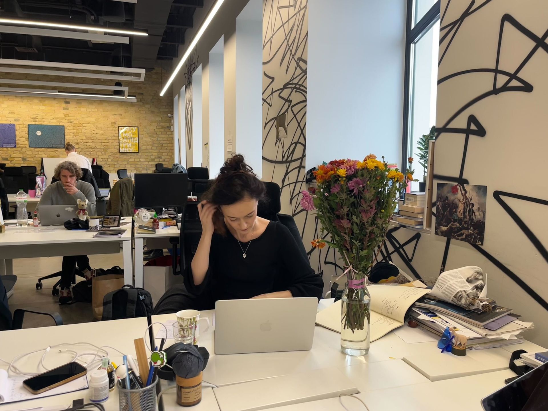 Editor-in-chief Olga Rudenko signs birthday cards for the team on Nov. 11, 2025, on the Kyiv Independent’s fourth birthday, in Kyiv, Ukraine. (The Kyiv Independent)