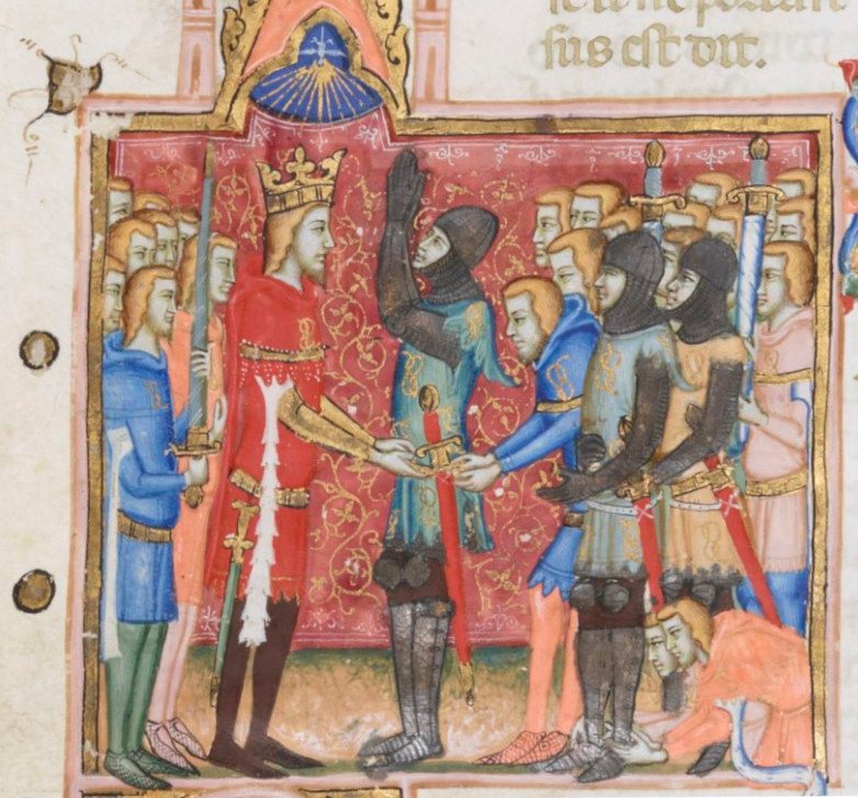 Investiture of a knight (miniature from the statutes of the Order of the Knot, founded in 1352 by Louis I of Naples) – Public Domain