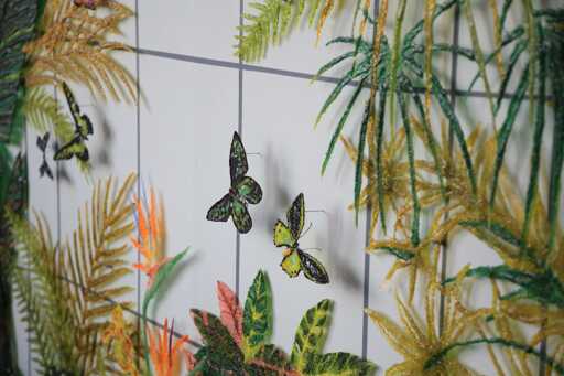 Clements works with a granular substance called frit, which she composes into forms like leaves, insects, and birds directly onto a kiln shelf. When fired, these colorful drawings fuse into wafer-thin panels, which she then applies to painted panels or suspends in installations. Often incorporating patterns evocative of wallpaper and motifs that suggest architectural structures or niches, she plays with relationships between rigidity and fluidity and the artificial and the organic.