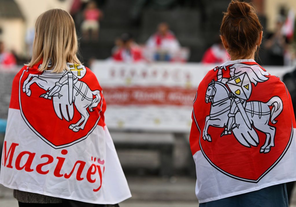 Members of the Belarusian diaspora, many displaying white-red-white opposition flags, gather at Krakow’s Market Square for the Day of Solidarity with Belarus rally, on Aug. 9, 2024, in Krakow, Lesser Poland Voivodeship, Poland. (Artur Widak/NurPhoto via Getty Images)