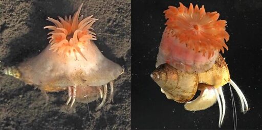 Japanese researchers have described a new species of sea anemone that appears to share a mutually beneficial relationship with hermit crabs. The pale pink sea anemones, now named Paracalliactis tsukisome, were found attached to the shells of hermit crabs (Oncopagurus monstrosus). The researchers described the anemone based on 36 specimens that fishing trawlers collected between 2017 and 2024 from various locations off the coast of Japan at depths between 192 and 470 meters (630 and 1,542 feet). The anemones, the team observed, were all attached to the tops of hermit crab shells and spatially oriented in the same direction. “3D CT imaging revealed a consistent, unidirectional attachment pattern near the shell’s opening, suggesting a basic sense of orientation,” Akihiro Yoshikawa, the study’s lead author from Japan’s National Museum of Nature and Science, told Mongabay by email. The anemone’s asymmetry and sense of orientation were unusual because sea anemones, like starfish, usually display radial symmetry, meaning a line drawn through their middle can divide the animals into halves many different ways, like slicing a pie. Radial symmetry allows anemones to interact with their environment from all directions equally. P. tsukisome “can form asymmetric, snail-shaped structures—a phenomenon extremely rare in evolutionary terms,” Yoshikawa said. “This finding offers valuable insight into how simple animals perceive spatial orientation and could provide a model for studying early forms of body asymmetry.” The team’s analysis found that anemones feed partly on the waste of their host, hermit crabs, and on surrounding organic particles. So, the hermit crabs…This article was originally published on Mongabay