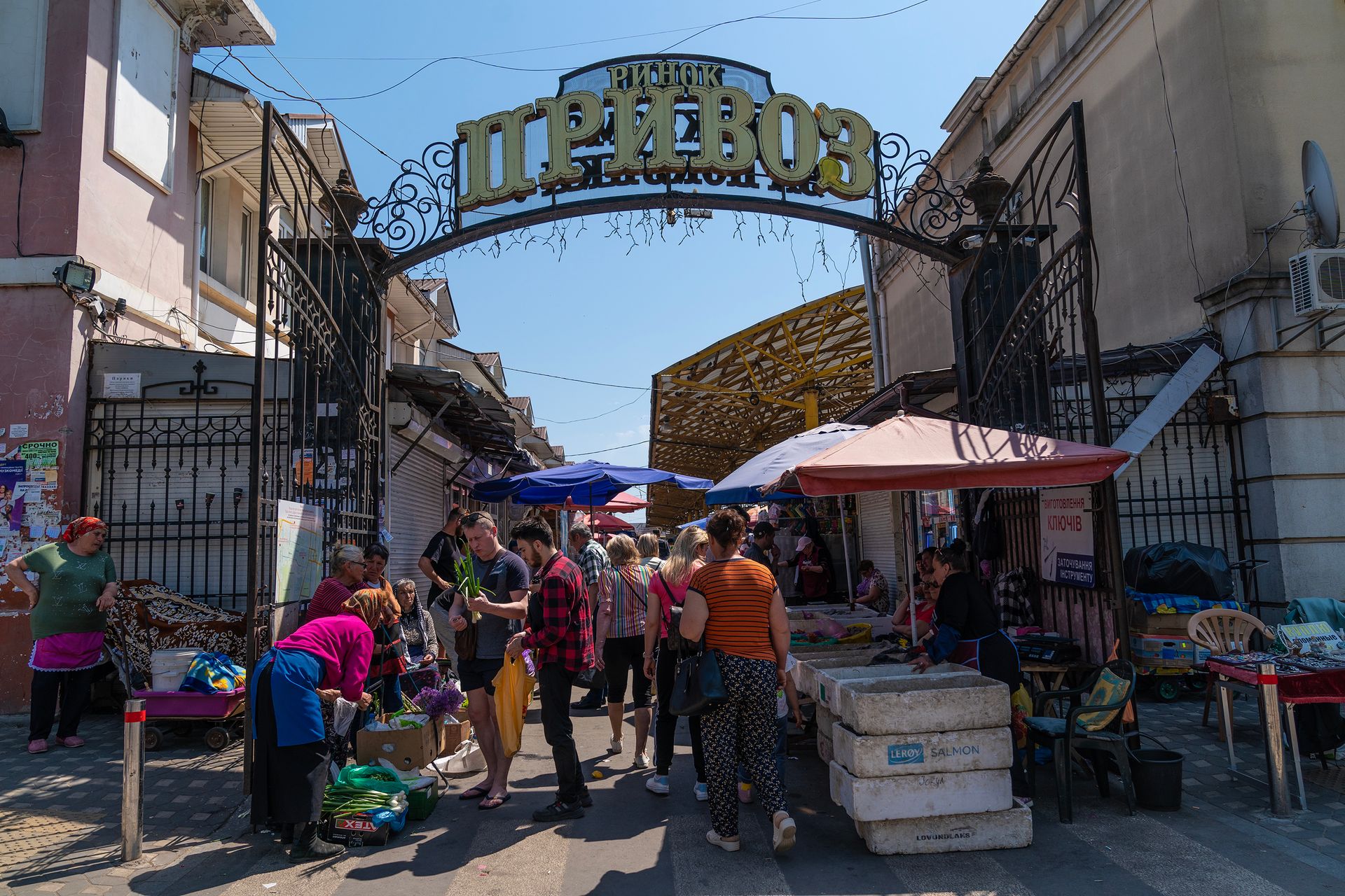 The entrance to the historic Pryvoz farmers market, established in 1827, in Odesa, Ukraine, on May 20, 2023. (Lev Radin / Pacific Press / LightRocket via Getty Images)