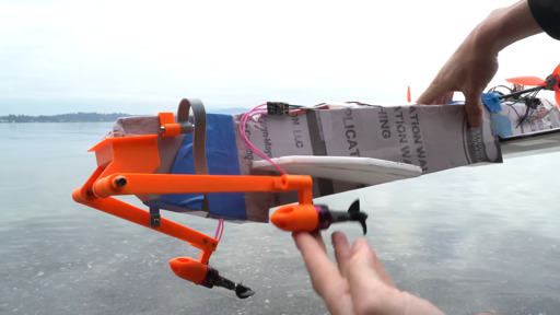 In this video, [rctestflight] takes a few stabs at trying to solve the stability problem– he starts with a flat planing hull on the nose, with the idea that the vehicle will be nose-heavy enough to ride serenely over the water. Water isn’t actually flat, though, and the nose bumping over the waves wasn’t able to do what he wanted. He then switches to a feeler that is to ride on-surface to adjust the pitch of the nose-mounted propellers–up if it pokes the water, down if it can’t– to provide passive pitch stabilization. That does work at some airspeeds, but produces a predictable porpoising effect, even with an elastic band for damping. That design might show promise with more refinement, but if you’re using something to give altitude feedback, it might as well be lidar.