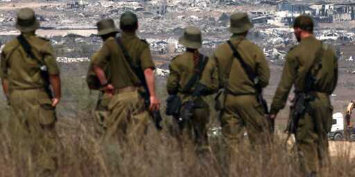 Israeli army soldiers look at destroyed buildings in the Gaza Strip as they stand on the border with the Palestinian territory, on August 13, 2025. (Photo by JACK GUEZ/AFP via Getty Images).