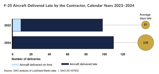 The DOD also pays out hundreds of millions of dollars in incentives to ensure timely delivery, but the companies are just pocketing the money. The delivery times are getting worse—in 2023 F-35’s were delivered 61 days late, on average, and last year was four times that—238 days. And in 2024, every single F-35 was delivered late. This, again, after millions of dollars were paid to speed up the deliveries.