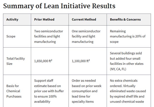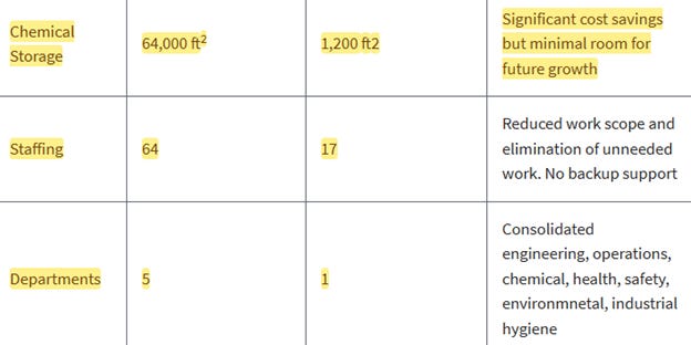 The report goes a few pages, but the results are above. Lockheed’s facilities for manufacturing were shrunk, by over a third. For chemical storage, the company went from using 64,000 square feet to just 1,200. Over there in the “benefits and concerns” column it says, “significant cost savings but minimum room for future growth.” About 2/3s of the employees in the division were laid off, and those who are still on the job have no backup support if one of them goes to work for Buc-ees.