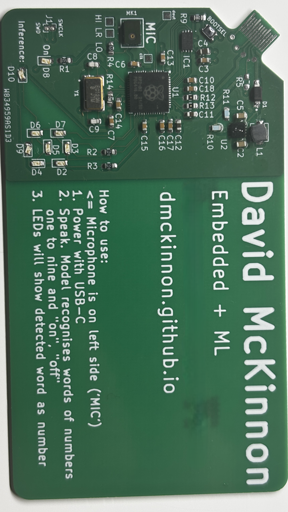 A PCB business card is a great way for electrical engineers to impress employers with their design skills, but the software they run can be just as impressive as the card itself. As a programmer with an interest in embedded machine learning, [Dave McKinnon] wanted a card that showcased his skills, so he designed one that runs voice recognition.