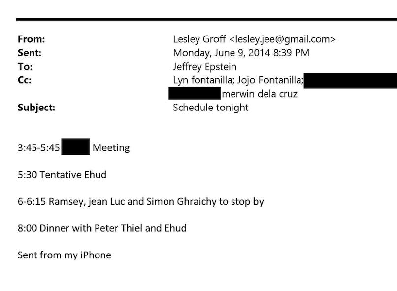 Barak had been scheduled to speak at Herzliya on June 10, 2014, and he planned to meet with de Rothschild at the conference—then, a few days before the conference began, Epstein informed Barak of last-minute plans for a dinner meeting with Peter Thiel on June 9, at Epstein’s mansion in Manhattan. Barak remained in New York, and canceled his meeting with de Rothschild in Israel.