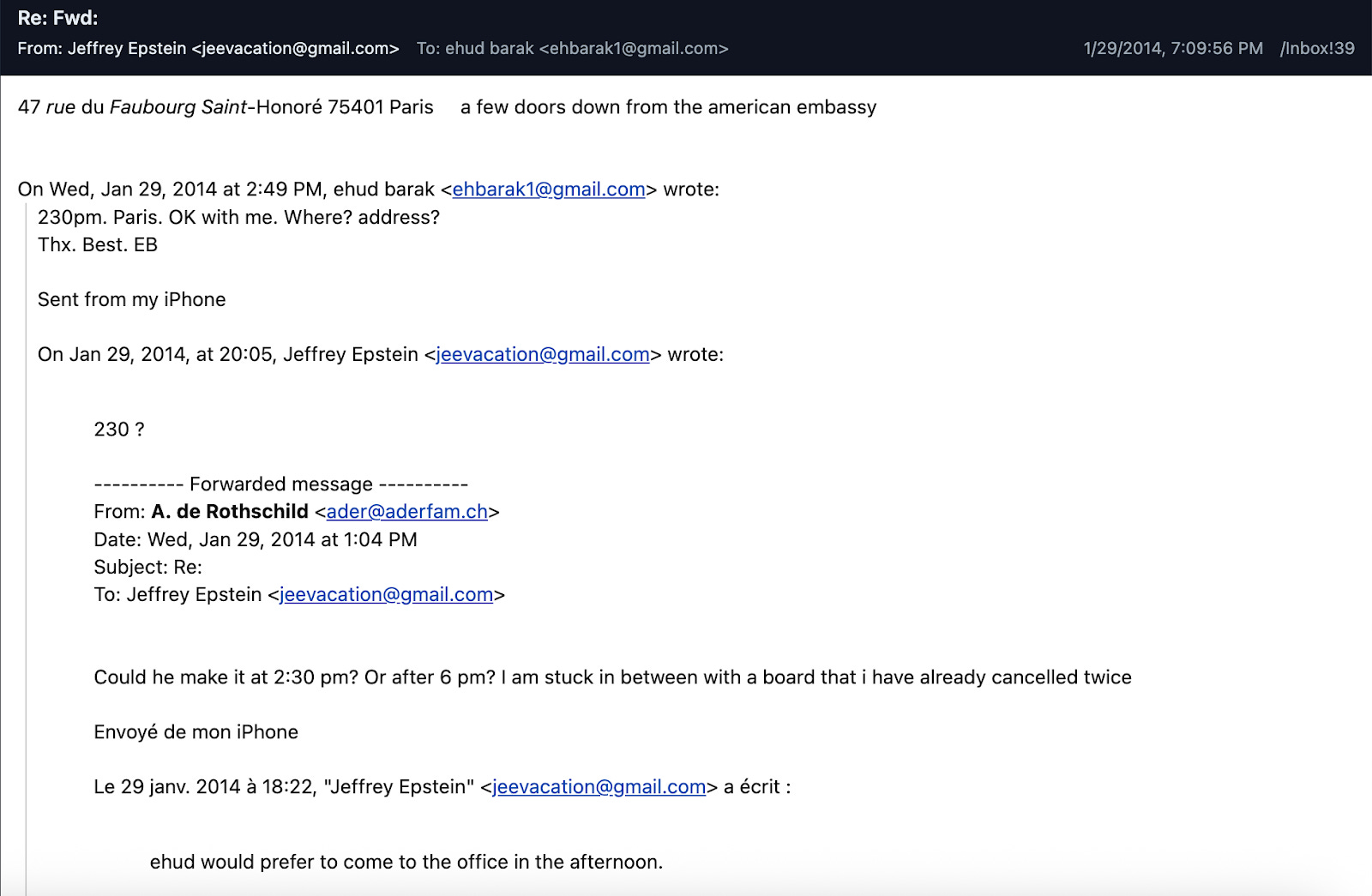 In the meantime, Epstein continued to foster the growing personal relationship between Barak and Ariane de Rothschild. On January 30, 2014, Epstein invited Barak to a dinner meeting in Paris with himself, de Rothschild, and French President Nicolas Sarkozy. Epstein himself bowed out of the meeting shortly beforehand, saying he had a cold. But, in a sign of his close interest in the meeting, he managed all the logistics by email, ultimately arranging for Barak to visit the Rothschild bank’s office in Paris.