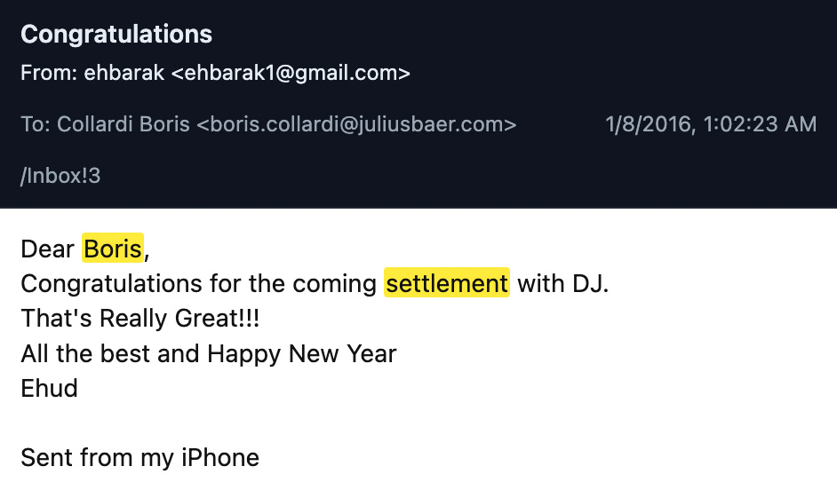 One month later, on January 1, 2016, Barak sent a congratulatory email to Collardi on Julius Baer’s settlement on a separate DOJ tax evasion case, in which the bank was accused of helping U.S. clients hide $600 million in undeclared Swiss accounts—the bank paid back nearly the full amount to the U.S. government. Barak wrote Collardi an enthusiastic note, “That’s Really Great!!!” Epstein sent Barak a copy of the the Justice Department’s civil forfeiture demand, requiring Julius Baer to surrender $220 million. Collardi did not respond to Drop Site’s request for comment.