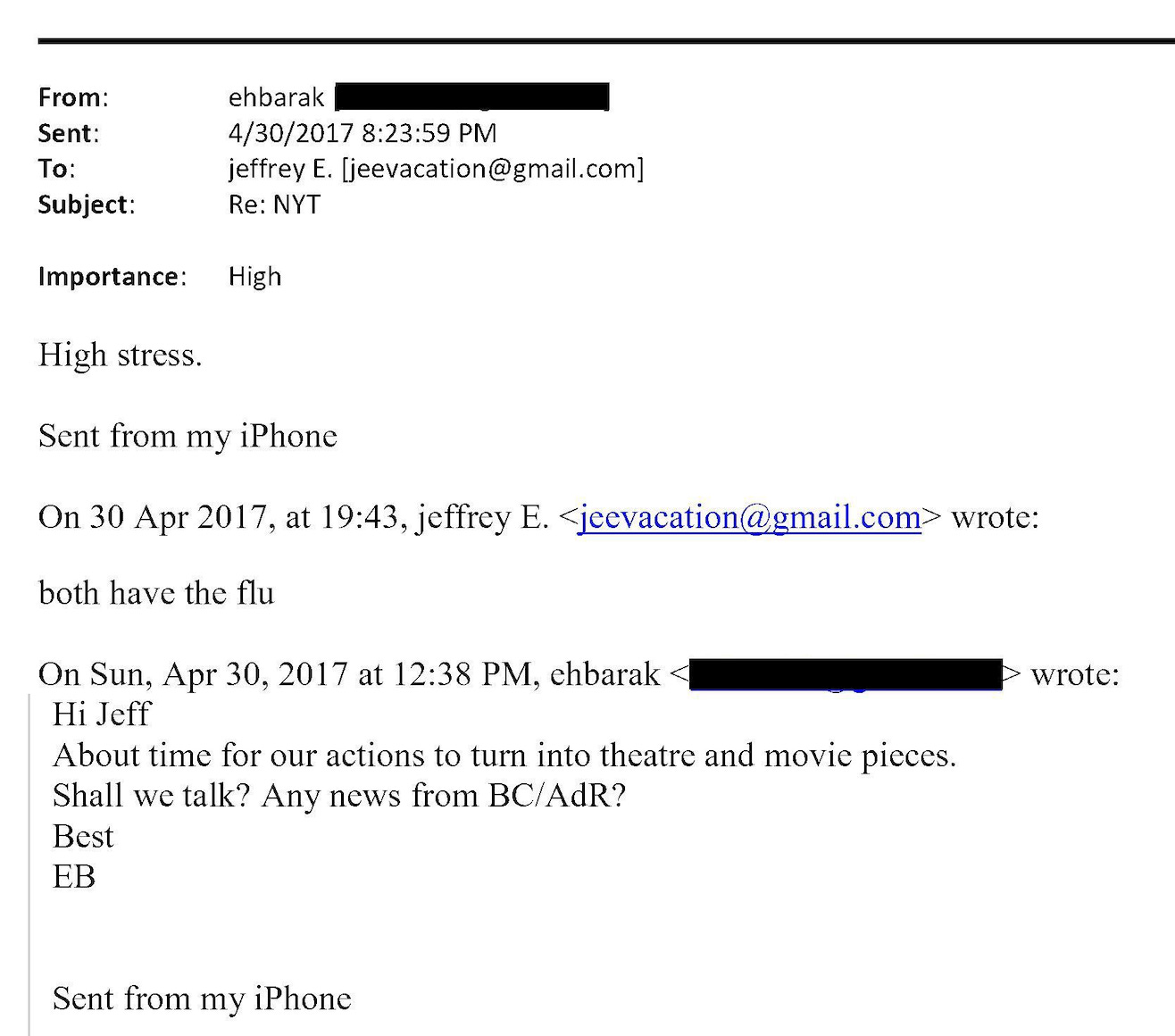 On April 30, 2017, Barak shared a cryptic e-mail with Epstein, in an email thread discussing a The New York Times review of the Broadway play Oslo, about Norwegian diplomat Terje Rød-Larsen – a close friend of Epstein’s who played a part in the 1990s peace process between Israel and the Palestine Liberation Organization. “About time for our actions to turn into theatre and movie pieces,” Barak wrote, cheekily. “Shall we talk? Any news from BC/AdR?” Epstein wrote back, “both have the flu.” Barak replied: “High stress.”