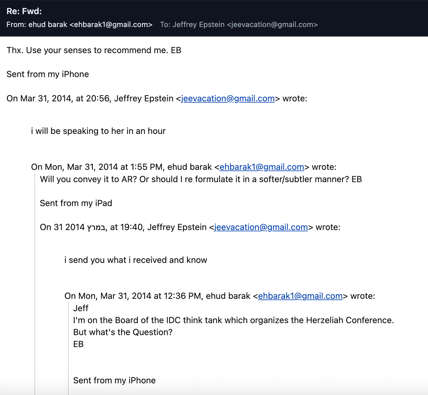 Barak wanted to be helpful, but he was unsure how to respond to de Rothschild’s message about the conference attendees: “I’m on the Board of the IDC think tank which organizes the Herzeliah (sic) Conference. But what’s the Question?” Epstein replied: “i send you what i received and know” and told Barak “i will be speaking to her in an hour.” Barak asked Epstein to gather more context: “Thx. Use your senses to recommend me.” The next day, Barak shared the conference speaker list with Epstein, to deliver to de Rothschild, with a note: “Pl don’t use this material with others.”