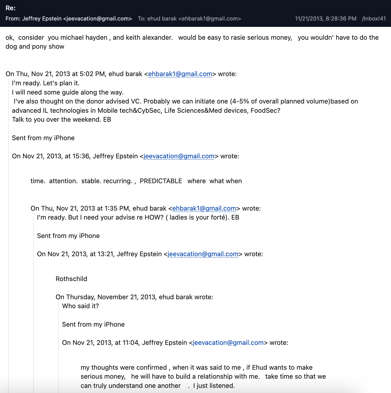 Epstein reassured Barak that he was in good company with former U.S. military leaders with lucrative careers peddling intelligence-linked cybersecurity products: former NSA and CIA director Michael Hayden and US cyber commander Keith Alexander. He wrote, “ok, consider you michael hayden, and keith alexander. would be easy to [raise] serious money, you wouldn’[t] have to do the dog and pony show.”