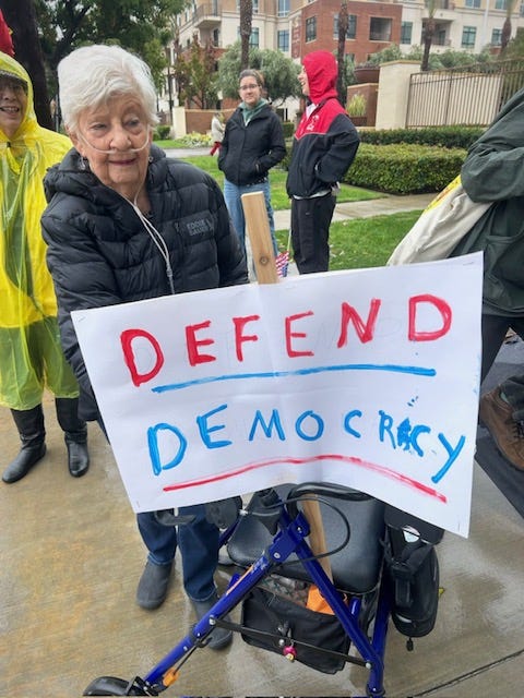 On 11/16/25, Northridge Indivisible and the Northridge Patriots held a Raising Canes rally to raise awareness about cuts to Medicare, Medi-Cal, and Social Security. The Northridge Patriots are a group of senior citizens at The Village at Northridge, an assisted living facility. Participants’ ages ranged from 67 to nearly 100 years old, and then some younger people joined.