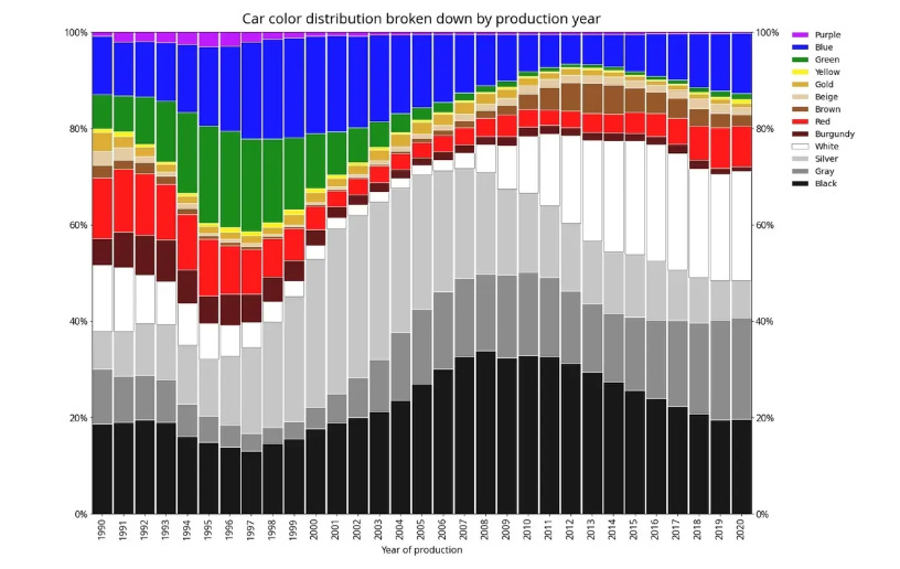 People are even buying less colourful cars. Black, white and grey have swamped the market. Burgundy (once more popular than white) has been all-but obliterated.