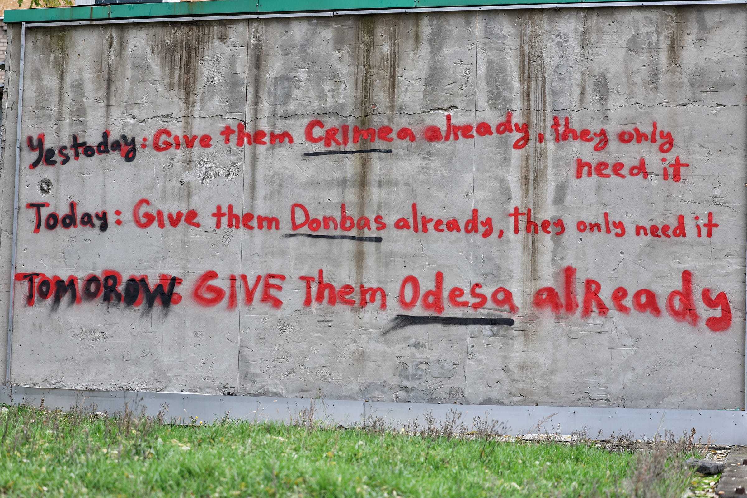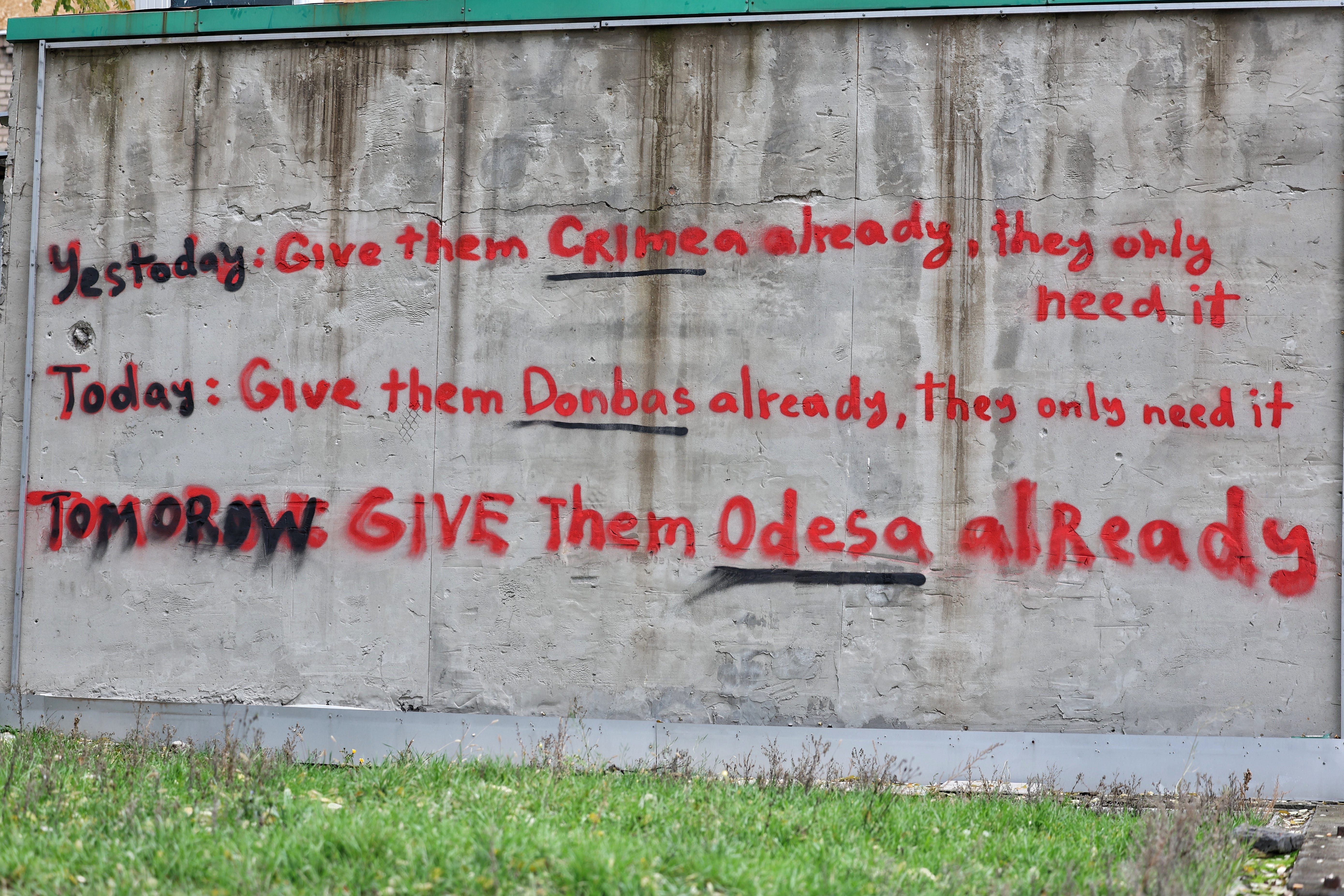 An inscription on the wall of a building in Kostiantynivka, Donetsk Oblast, Ukraine reads “Yesterday: give them Crimea already, they only need it. Today: give them Donbas already, they only need it. Tomorrow: give them Odesa already.” U.S. and Russia jointly drafted a Ukraine deal that gives Russia land in the Donbas, prevents Ukraine from joining NATO, and eases sanctions (Photo by Yan Dobronosov/Global Images Ukraine via Getty Images).