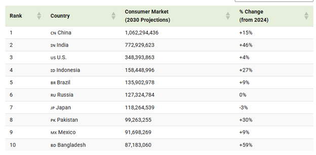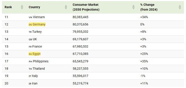 And there are the tabular data for the top 20, ranked by the size of the respective consumer markets five years from now: China at a billion plus. That 15% increase in China, by the way is the equivalent of adding two entire Germany’s worth of consumer demand in five years, and Germany isn’t going to grow at all.