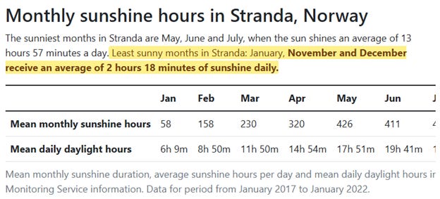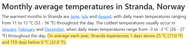 What’s more, the success of the Norway project was surprising, because of where Norway is. Above are the climate data for Stranda. On average each year, they see one day above 25 degrees, and 159 days below zero.