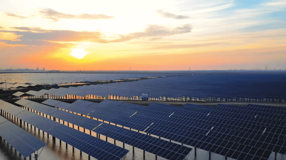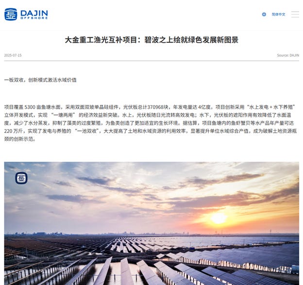 These are bifacial solar panels—with solar cells on both sides of the panel, and they put 370,000 of them on a fish farm. This is the announcement from the company, Dajin Offshore, for the new hybrid fish-solar farm in Tangshan, Hebei: