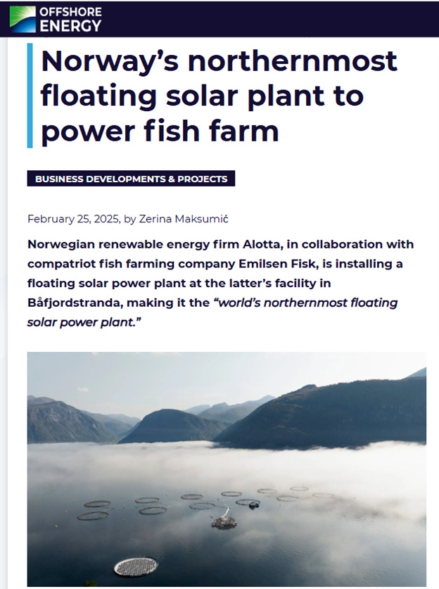 Norwegian fish farm doubles floating solar after first plant cuts diesel by 90%https://interestingengineering.com/innovation/norwegian-second-floating-solar-plant370,000 solar panels grace one of world’s largest hybrid fishery farms in chinahttps://interestingengineering.com/energy/massive-solar-farm-with-370000-solar-panelsAlotta implements a floating solar plant to make aquaculture more sustainablehttps://inspenet.com/en/noticias/alotta-implements-a-floating-solar-plant-to-make-aquaculture-more-sustainable/H1 2025: China installs more solar than rest of the world combinedhttps://electrek.co/2025/09/02/h1-2025-china-installs-more-solar-than-rest-of-the-world-combined/Norway%E2%80%99s northernmost floating solar plant to power fish farmhttps://www.offshore-energy.biz/norways-northernmost-floating-solar-plant-to-power-fish-farm/