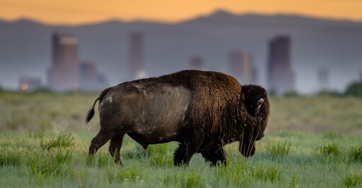 Matt Dirksen / iStockphoto / GettyA bison walks through the Rocky Mountain Arsenal National Wildlife Refuge in Colorado, with the Denver skyline visible in the background.