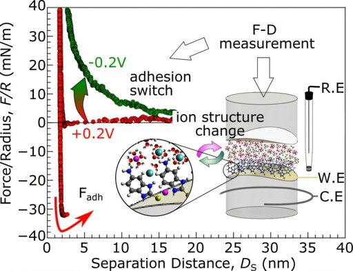 What if a surface could instantly switch from sticky to slippery at the push of a button? By using electricity to control how ions and water structure at the solid liquid interface of self-assembled monolayers of aromatic molecules, researchers at National Taiwan University have created a molecular-scale adhesion switch that turns attraction on and off.