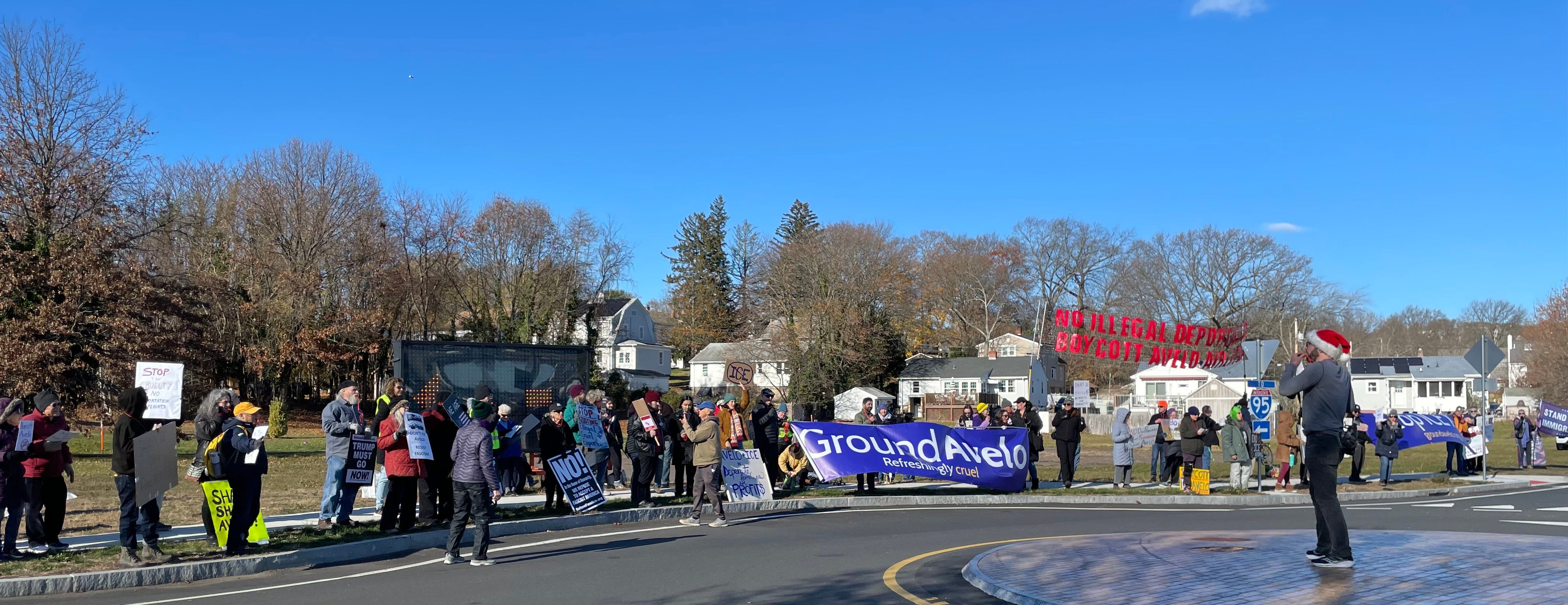 There are protests nationwide against Avelo Airlines. The rallies, in 15 airports across 13 states, are being held in Arizona, Connecticut, Delaware, Florida, Louisiana, Maryland, New Hampshire, New Jersey, New York, North Carolina, South Carolina, Tennessee, and Virginia, to protest Avelo’s $150 million contract with ICE, under which it flies deportation flights without due process. Here is a photo from New Haven, CT’s Tweed Airport, where about 100 activists gathered today to protest the airline.