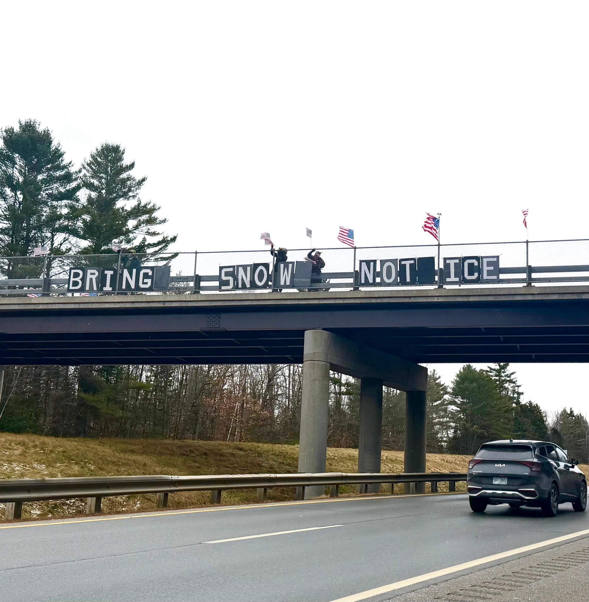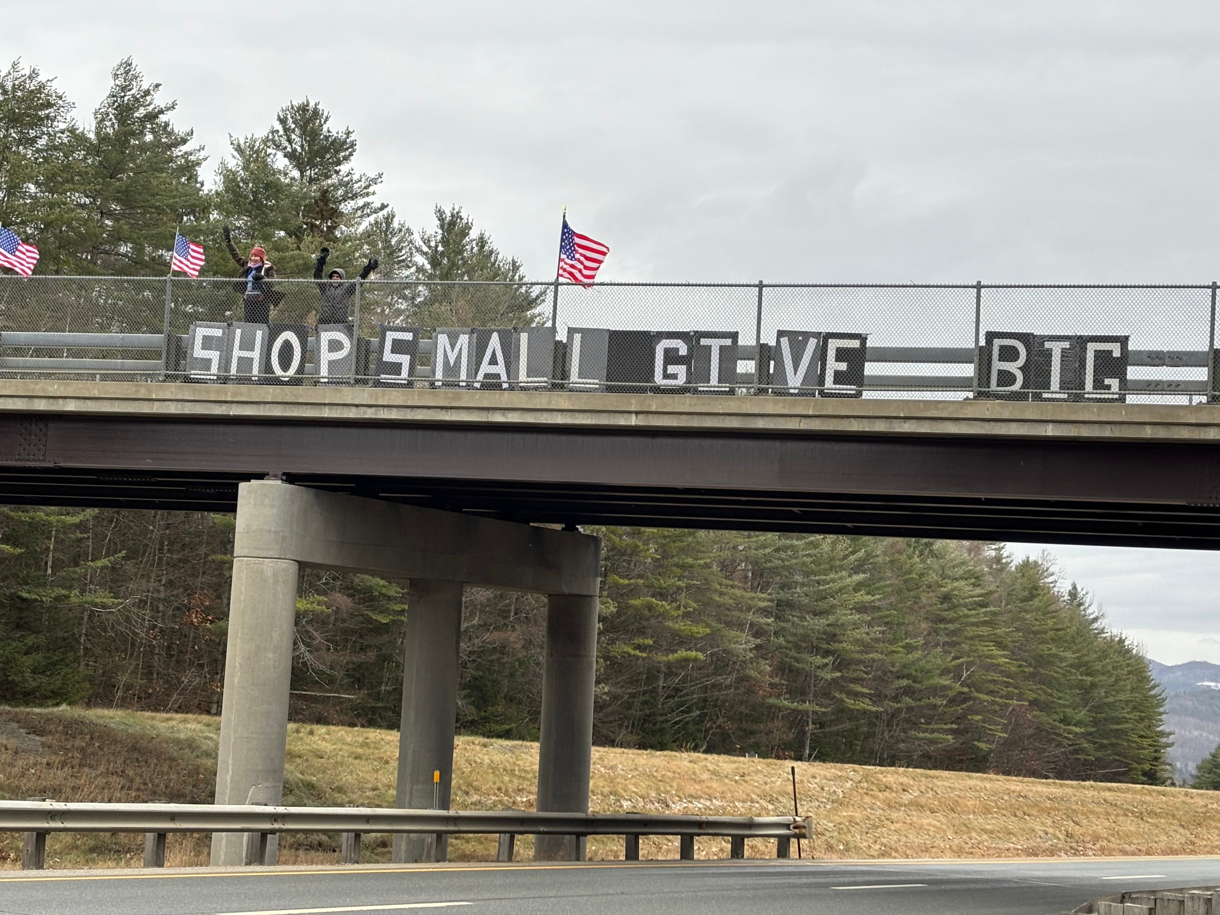 Today we had to move our North Country Resilience Bridge Brigade’s message to an I-93 overpass in Bethlehem, NH, because the weather was too severe in Franconia Notch. Our heroic team was able to do it, and put up our messages: “Shop Small Give Big,” and in response to a recent ICE raid in Plymouth, NH, “Bring Snow Not ICE.”