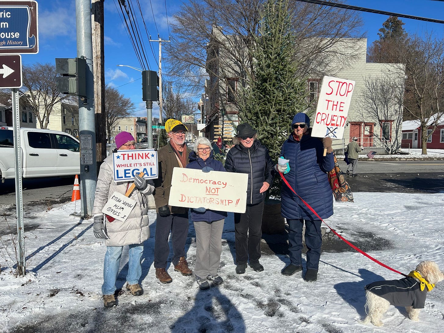 A group of the regular “conscientious objectors” on one of the “Four Corners for Democracy” in Salem, NY, population circa 2600. The location is easily found at the only traffic light in town. We have been gathering every Saturday morning since last February. Right now, we are out there conditioning for the colder temps but better days ahead!