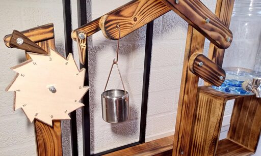 In a clever build detail, the floating siphon tube also holds a pointer to an hour indicator. For minutes, his mechanism seems unique, though it’s related to another ancient trick, the Pythagorean cup. Pythagoras’s devious cup had a hidden siphon that spilled its contents if you filled it beyond a set level, and so does the secondary reservoir of [Liebregts] water clock.