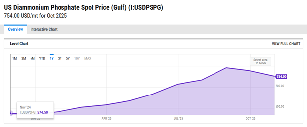 So domestic suppliers–American fertilizer producers–are raising their prices. Gulf DAP is diammonium phosphate sourced from the Southern United States, and phosphate producers there are having one of their best years ever. A year ago DAP traded at $574 a ton, now it’s over $750 a ton: