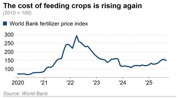 And the agricultural sectors in the US and Europe are heavily dependent on imported fertilizer to grow crops. Now the countries that produce that fertilizer are choosing to keep it for themselves, to grow their own crops, and prices are zooming higher.
