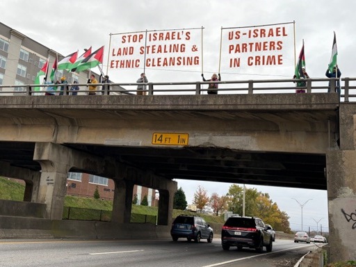 We on the bridge can see that more violence and repression is likely headed our way, in the world and also here in the US. Especially to our BIPOC communities and those of us who stand up against the madness. But what is our choice? Stand up, or bow down? We on the bridge, in our small way, have chosen to keep standing up, every week, using our giant banners to raise our voices. Sometimes it feels like a lonely mission, sending out the word about Palestine and trying to make connections from there to here.