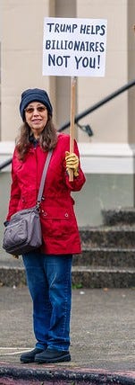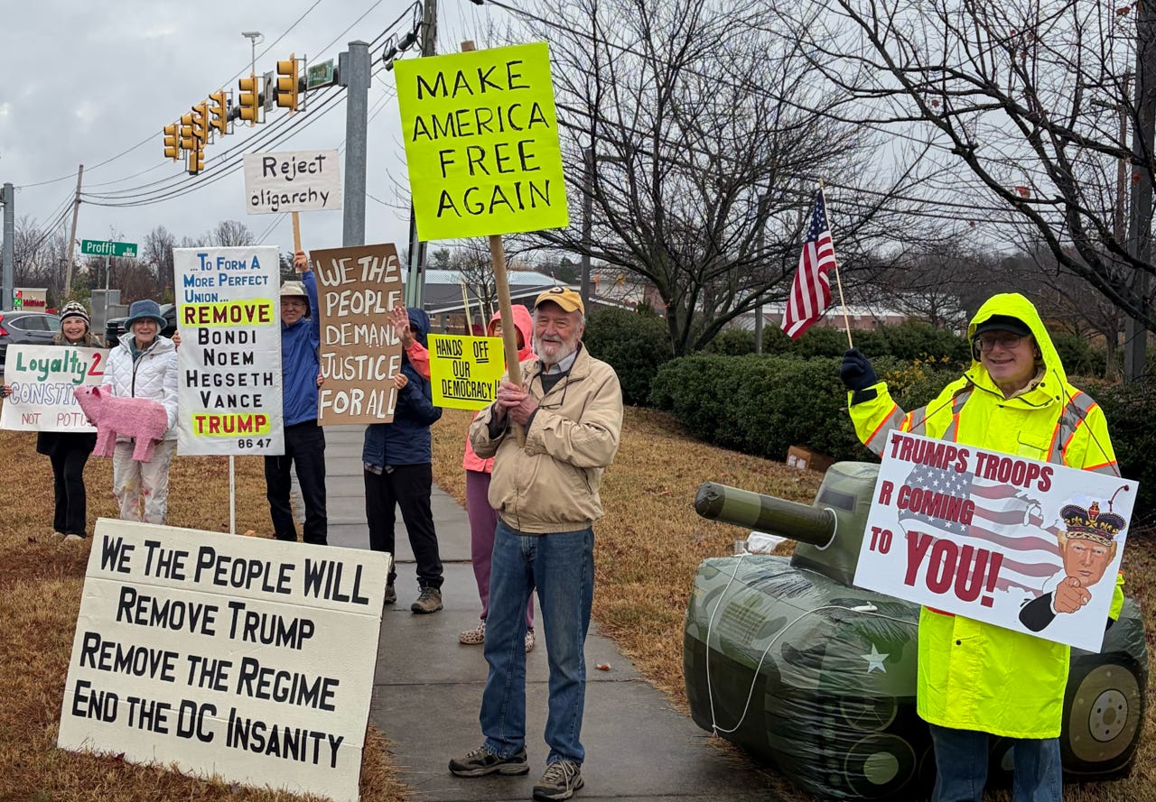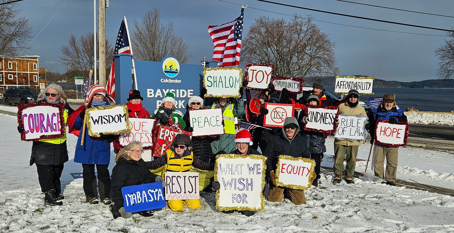 Today’s event was the 94th organized by Champlain Valley Indivisible’s roadside visibility crew since the chapter was created in the spring. For months they showed up on Shelburne Road in South Burlington, Vermont. For the last several months, organizers have rotated locations in additional communities including Colchester (pictured here), Williston and this coming week, Essex Junction.