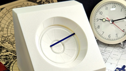 Reading the clock is quite straightforward once one knows what is going on. At its heart, the unmarked face is much like any other analog clock face, and on the inside is a pretty normal clock movement. The inner recessed track on the face represents hours, and the outer is minutes. The blue line connects the two, drawing a constantly changing line.